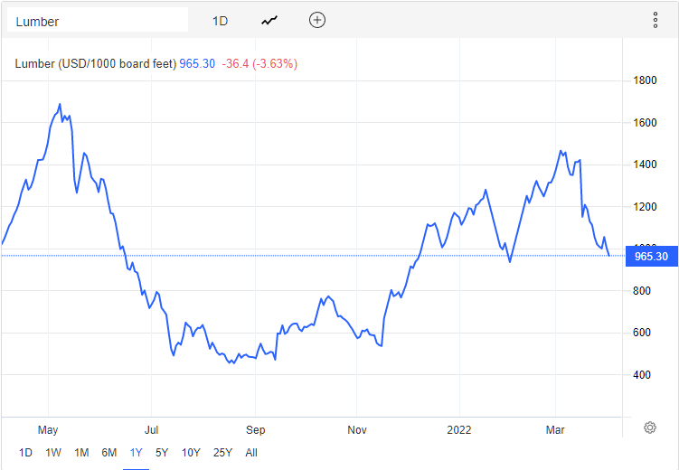 Throughout the remainder of the year, it remained volatile but decreased significantly, reaching lows of just over $400 per thousand board feet in late summer and early fall. Since then, lumber began another slow climb, reaching a peak of nearly $1,500 in early March. At the time of this writing, the price has dropped to under $1,000.